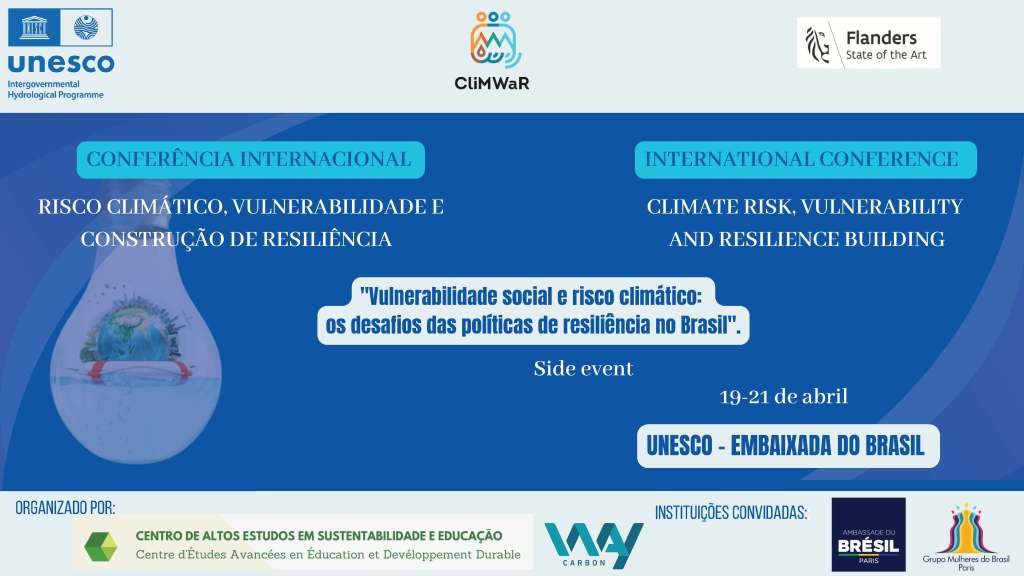 A primeira edição, intitulada “Climate Risk, Vulnerability and Resilience Building – International Conference”, ocorreu entre 19 e 21 de abril de 2023, realizada na UNESCO e na Embaixada do Brasil em Paris. O encontro reuniu juristas, pesquisadores e especialistas do Brasil, Europa, África e Oriente Médio, incluindo uma delegação de mais de 15 pesquisadores brasileiros que participaram do Side Event e da Mesa de Altos Estudos, coordenada pelo professor e pesquisador Dr. Clodoaldo Silva da Anunciação, e contou com a participação científica da Universidade Estadual de Campinas (UNICAMP), por meio do Dr. Raul Reis Amorim, que contribuiu com as pesquisas em parceria com a WayCarbon, instituição parceira do evento.